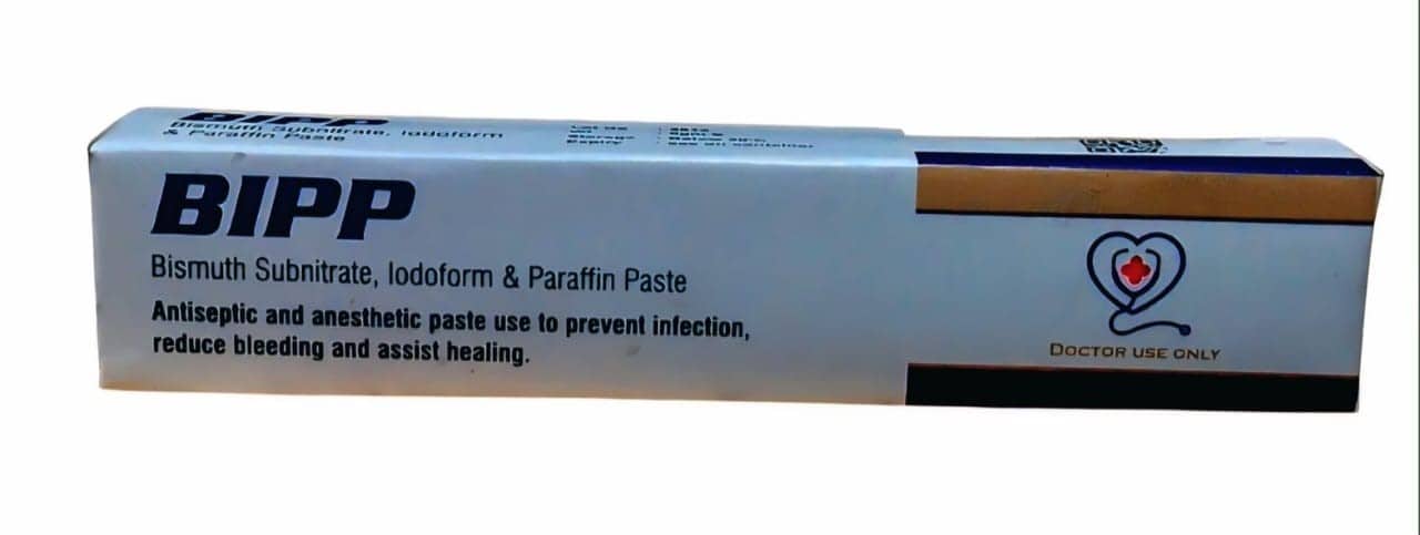 BIPP (Bismuth Iodoform Paraffin Paste) paste is a surgical dressing used for wound packing and dressing in Ear, Nose, and Throat (ENT), oral, and maxillofacial surgery. It provides pressure, acts as an antiseptic to prevent bacterial growth, and helps stop bleeding-