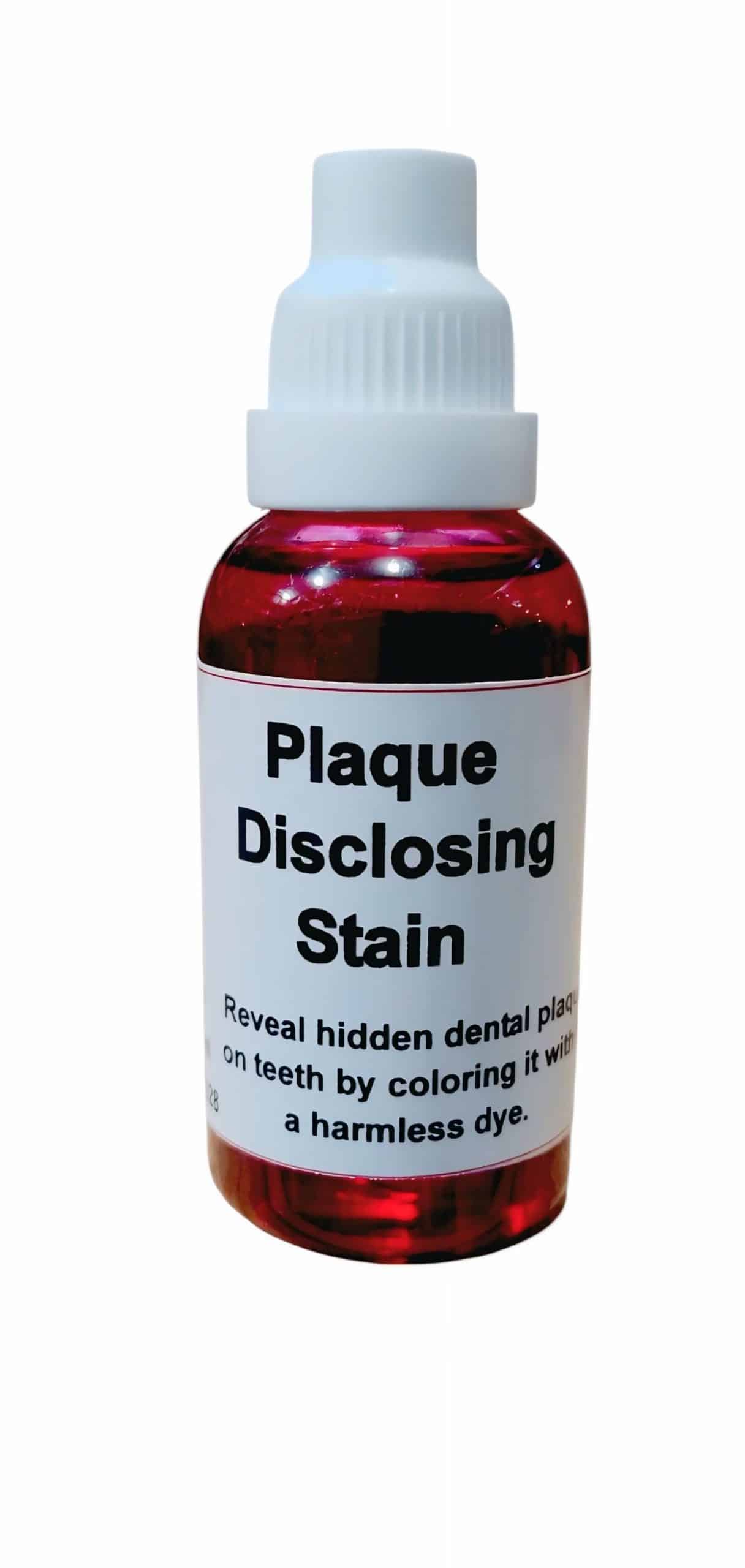 Plaque disclosing stain is used to identify missed plaque on teeth after brushing and flossing by temporarily staining it, allowing users to learn where they need to focus more attention and improve their oral hygiene. This solution contains a harmless dye that highlights the invisible bacterial biofilm (plaque) on tooth surfaces, making it easier to see problem areas and ensure a thorough cleaning.